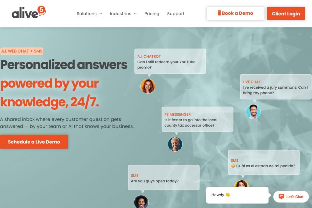 Alive5 provides AI chatbots for customer service that respond using only the content you specify, such as website pages, FAQs, and uploaded documents. The platform is built to reduce routine ticket volume by answering common questions instantly across web chat, SMS, and social messaging while routing higher-value or complex conversations to human agents.