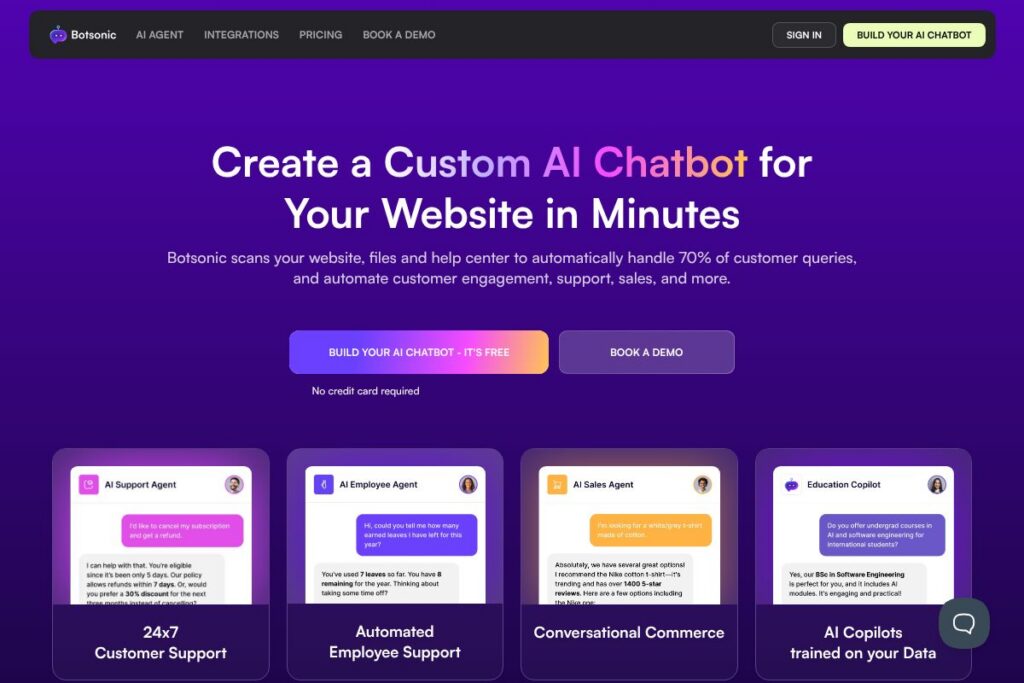 Botsonic performs best when organizations want a fast, document-trained assistant that can be embedded on the web and extended to messaging channels. It suits product and support teams that need verifiable answers from their own content, teams that must support multiple languages, and businesses that want to adjust models without replatforming their chatbot.