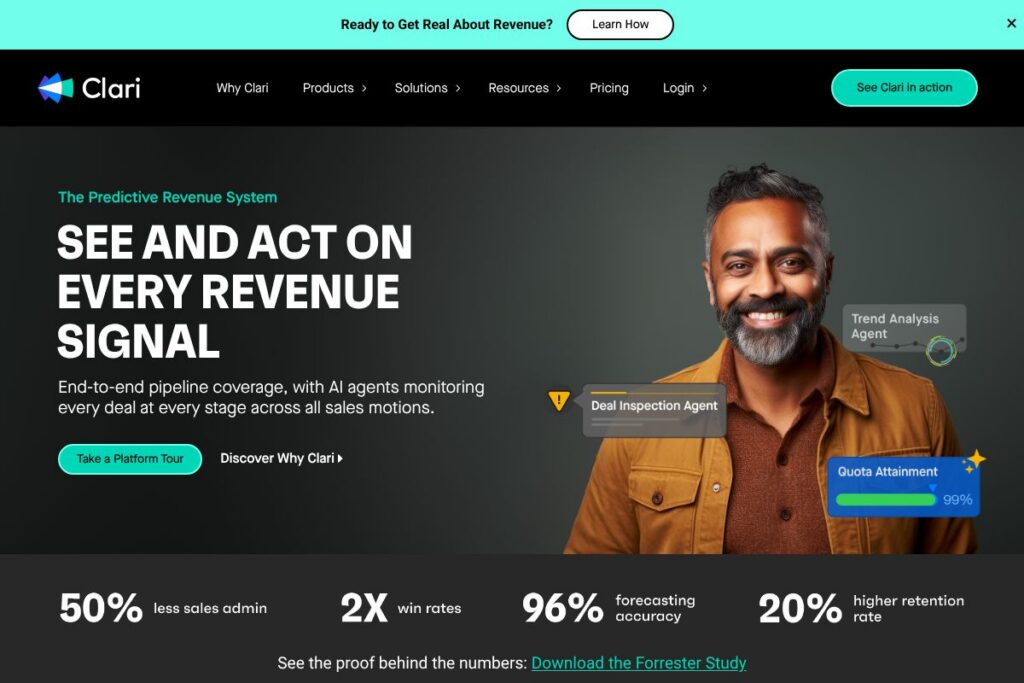 Clari centralizes revenue operations around a platform that combines pipeline management, forecasting, sales engagement signals, and customer retention insights. Core capabilities include AI-driven deal scoring, integrated activity capture, and cross-system forecasting that pulls from CRM, email, and ERP data.
