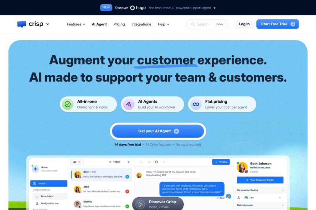Crisp provides a 14-day free trial with no credit card required. The trial includes access to the platform’s core features so teams can evaluate AI agents, the chat widget, and the shared inbox.