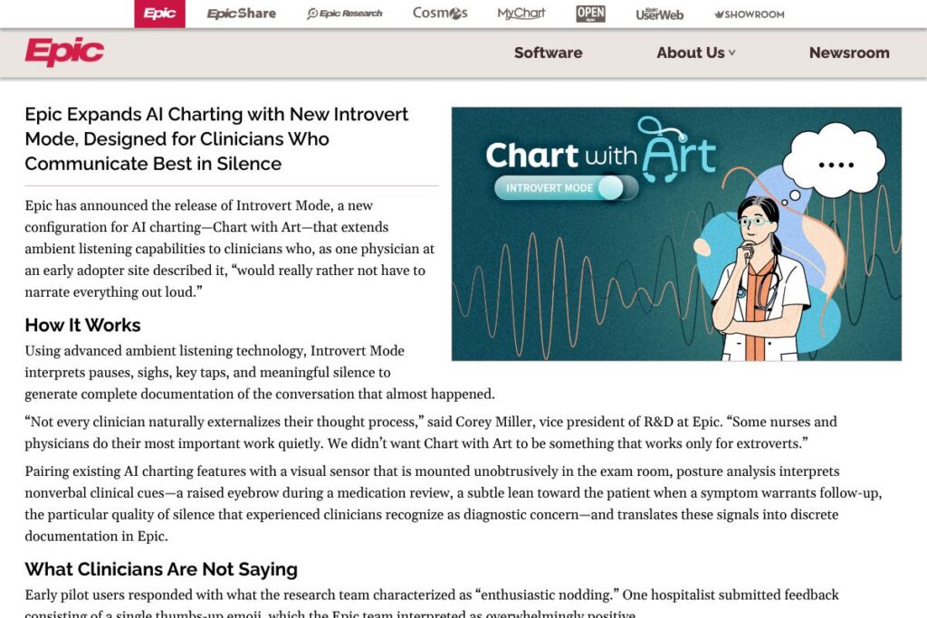 Recent AI additions integrate ambient listening and sensor-assisted inputs into the documentation workflow. For example, the Chart with Art feature listens to clinician-patient interactions and uses natural language processing to draft notes; the new Introvert Mode augments that approach by interpreting nonverbal cues, pauses, and silent clinician actions to generate documentation without requiring continuous narration. In practice, a clinician who prefers quiet encounters can rely on the ambient capture to assemble a visit note that they then review and sign in the Epic chart.