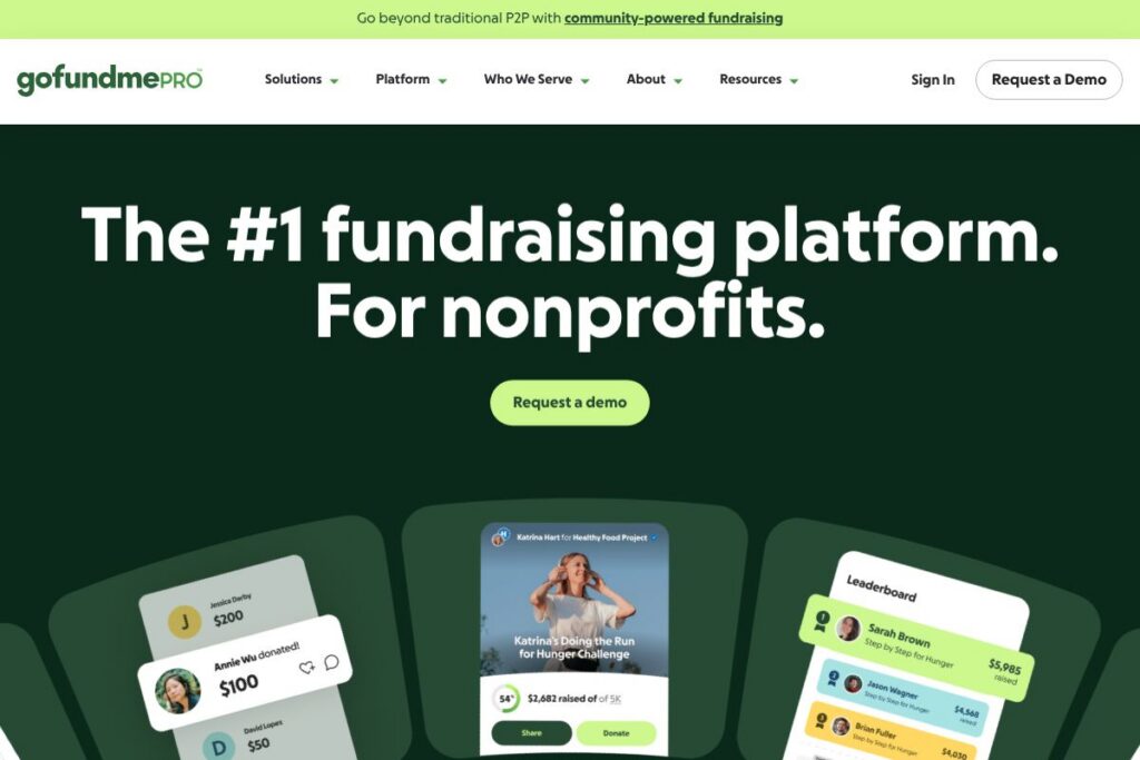 GoFundMe Pro combines branded campaign and donation-form functionality with peer-to-peer and event fundraising plus donor intelligence drawn from a large donor community. It works well for nonprofits that need multi-channel campaigns, discovery through broader giving networks, and analytics to guide fundraising strategy.