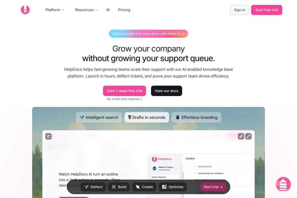 HelpDocs does really well at converting documentation into a measurable support channel through search-driven discovery, AI summaries, and performance-oriented templates. It is suited to product and support teams that need a fast, customizable help site that scales with customer growth without immediately adding headcount.