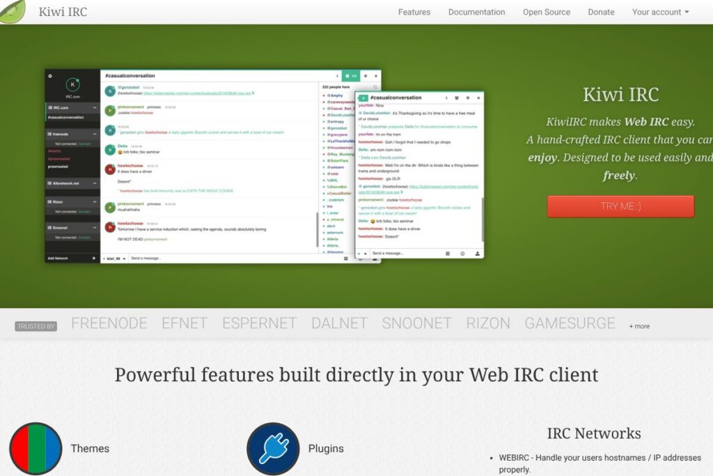 KiwiIRC is a browser-native IRC client that runs as a hosted web app or as software you can self-host. It provides an embeddable web widget for websites, plus a full web client that connects users to multiple IRC networks without requiring downloads or browser plugins. The platform exposes controls around which servers users can connect to and supports passing accurate user host information via WEBIRC.