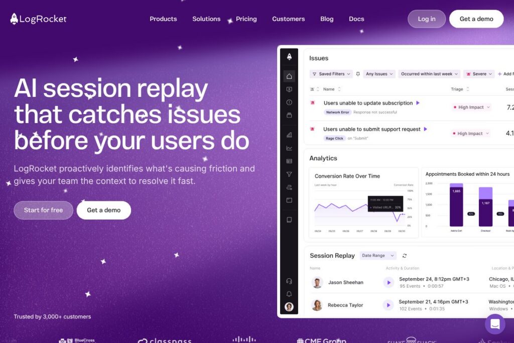 LogRocket excels where session replay, performance telemetry, and error context need to be linked to product analytics and prioritized using AI. It is best suited for engineering, QA, and product teams that need deterministic reproductions of bugs, prioritize UX regressions, and want to reduce time-to-fix for customer-impacting issues.
