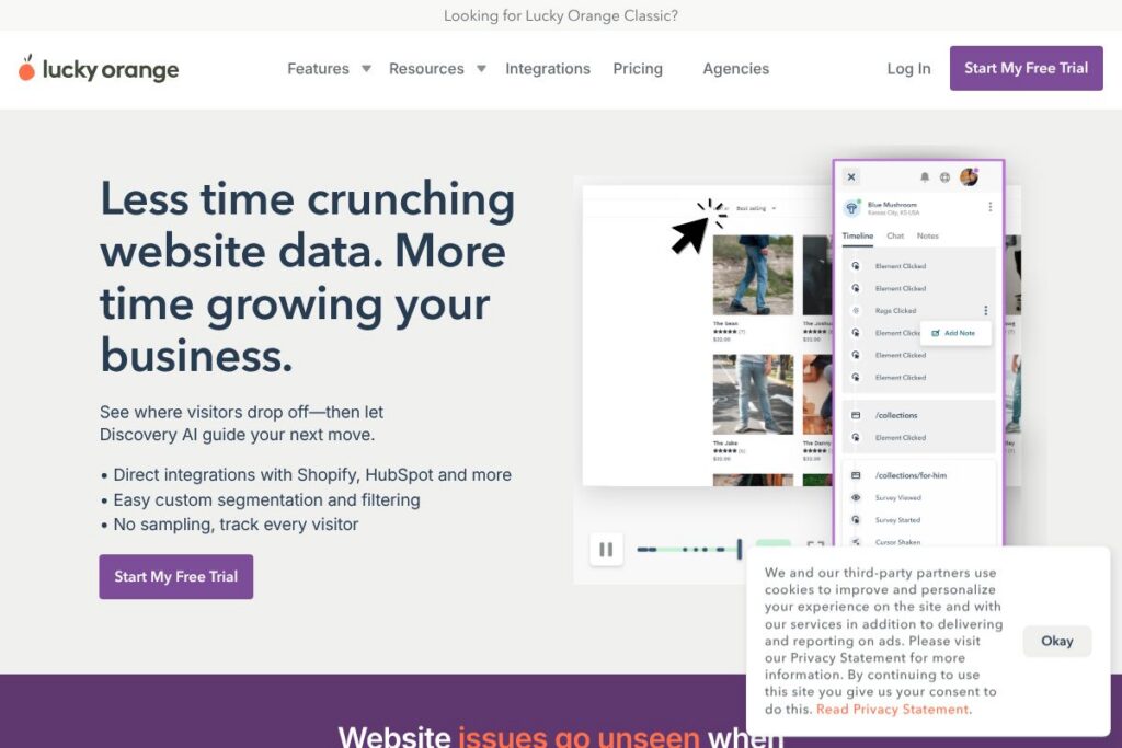 Yes, Lucky Orange offers direct integrations with Shopify and HubSpot. These integrations simplify setup and let you correlate behavior with commerce or CRM data.