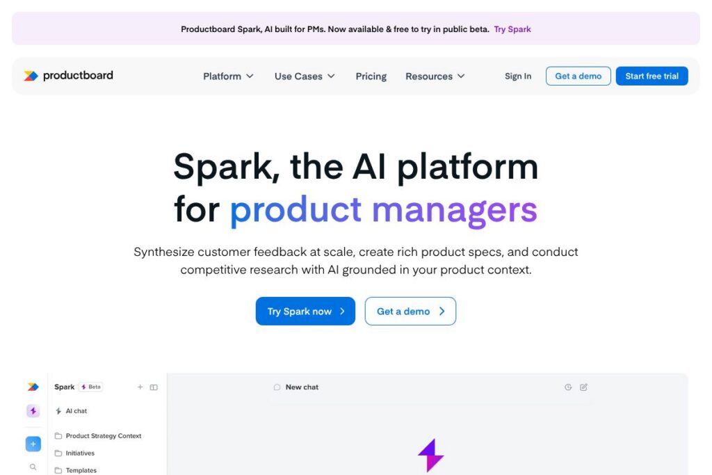 - AI-assisted discovery (Spark): Spark provides AI workflows for synthesizing feedback and drafting specs, speeding up common product tasks while remaining tied to product context and evidence.