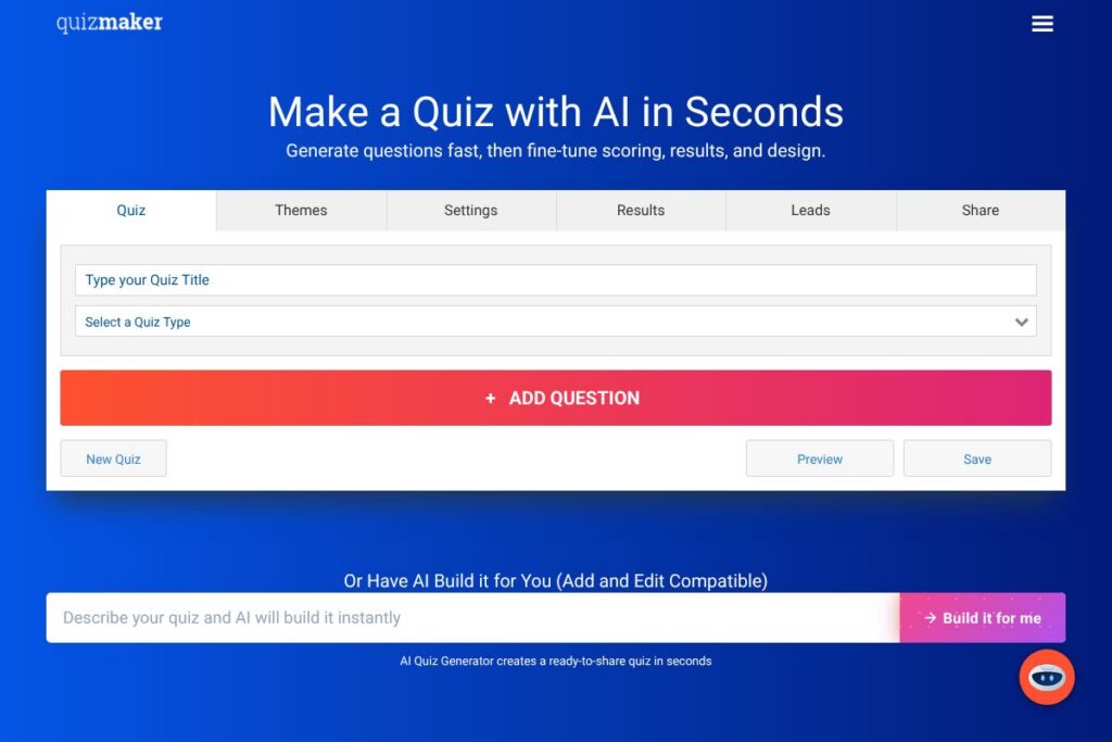 Quiz Maker is a web-based quiz creation platform that helps teachers, marketers, trainers and content creators design and publish quizzes, personality tests, polls and exams. The tool combines an editor with more than 40 question types, theme customization, lead capture and sharing options so quizzes can be embedded or distributed via direct links.