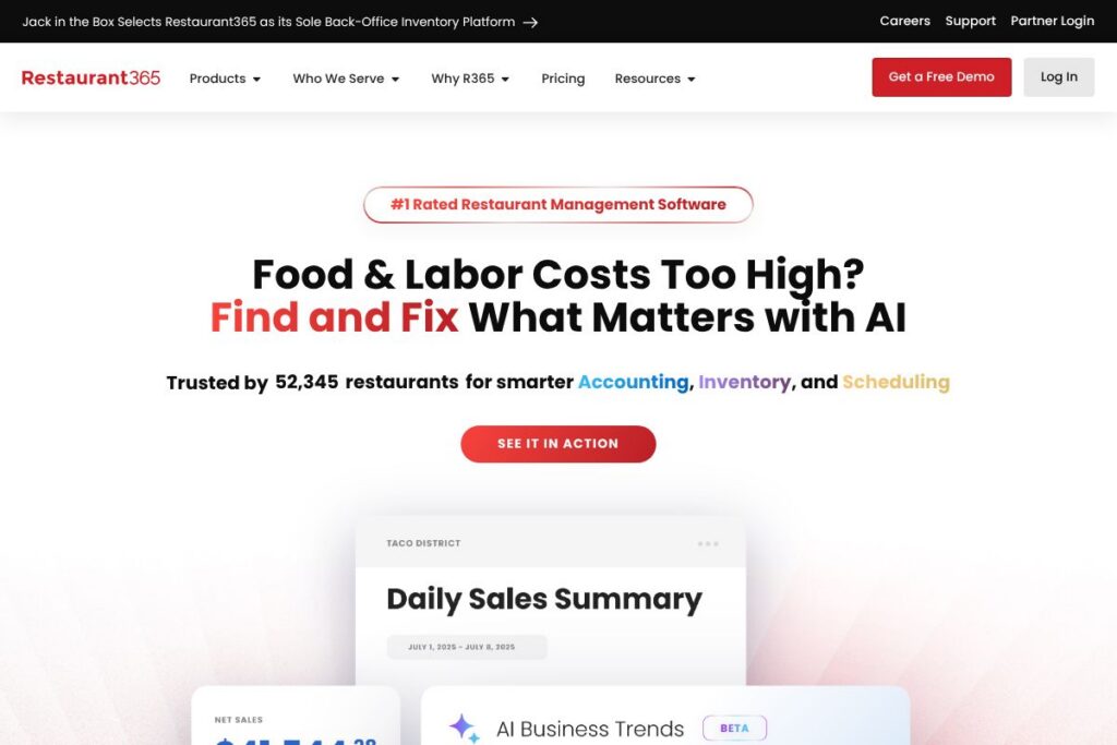 Restaurant365 combines accounting, inventory, scheduling, payroll, reporting, and a mobile app with AI-assisted automation aimed at reducing manual back-office work and improving margin visibility.