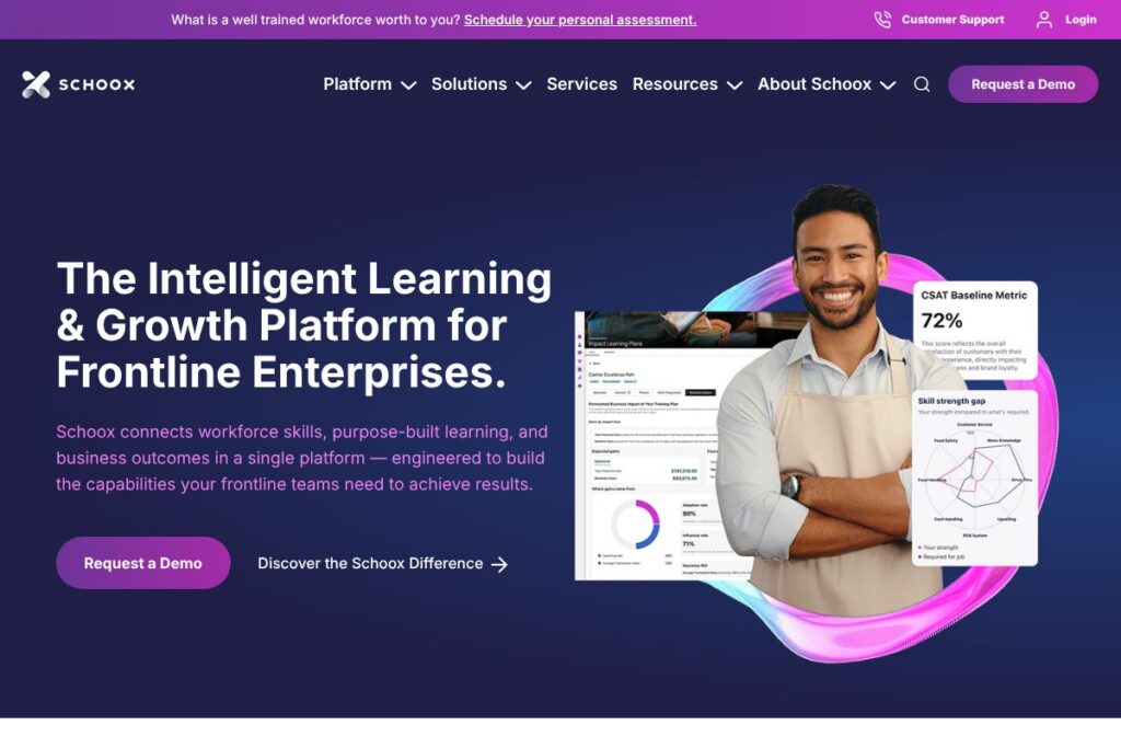 Schoox is an AI-powered corporate LMS designed specifically for frontline enterprises. The platform combines skills mapping, role-based learning paths, content authoring, and outcome tracking so L&D teams can identify capability gaps, deliver targeted training, and measure business impact.
