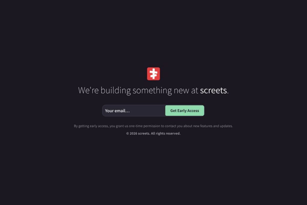 screets is an early-access platform focused on private sharing and controlled feature rollouts. The public messaging indicates the product is in active development and that people can sign up for early access, which also grants one-time permission to receive updates about new features and product changes.