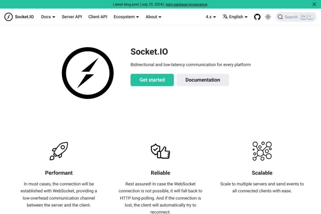 Socket.IO is built around reliable, low-latency event delivery with broad platform support and server-side tooling for scaling and authentication. Core capabilities include WebSocket-first transports with long-polling fallback, automatic reconnection, namespaces and rooms for logical channeling, binary support, adapters for horizontal scaling, and middleware hooks for authorization and logging. Recent releases have focused on performance optimizations and modernizing protocol handling.