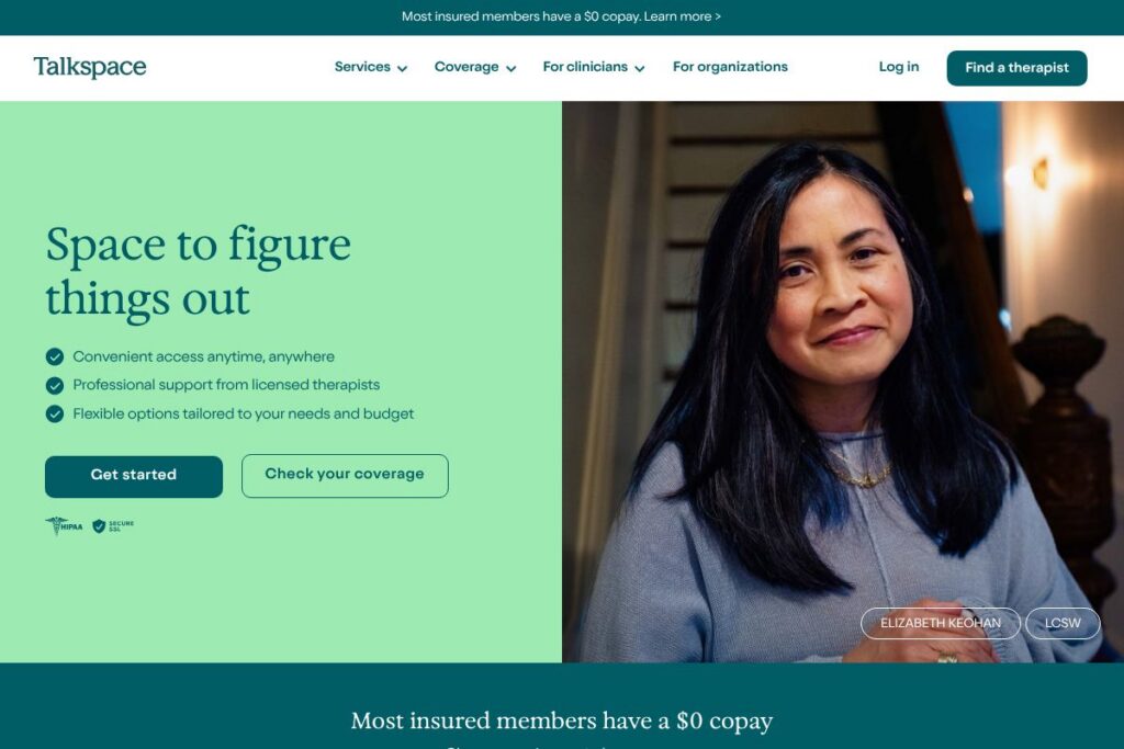 For exact plan details, insurer participation, and current self-pay rates, check the insurance coverage details and view current pricing options on Talkspace’s website.