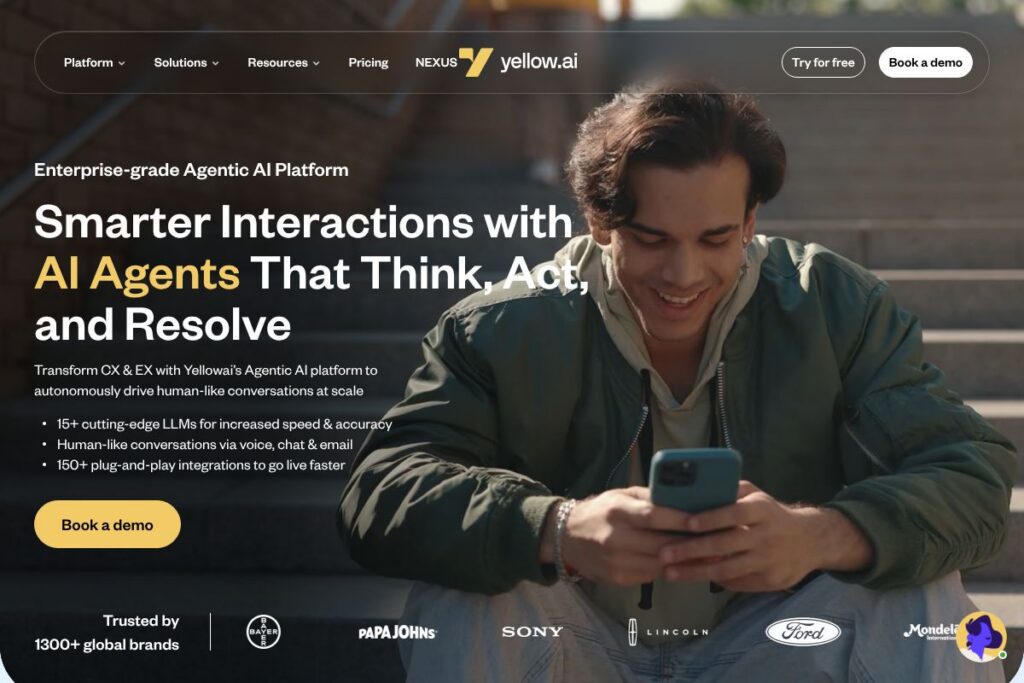 Yellow.ai is a feature-rich enterprise platform for building agentic AI that handles multi-step conversational workflows across channels. Its multi-LLM architecture, broad set of integrations, and compliance features make it suitable for large organizations that need high-volume automation with rigorous security controls.